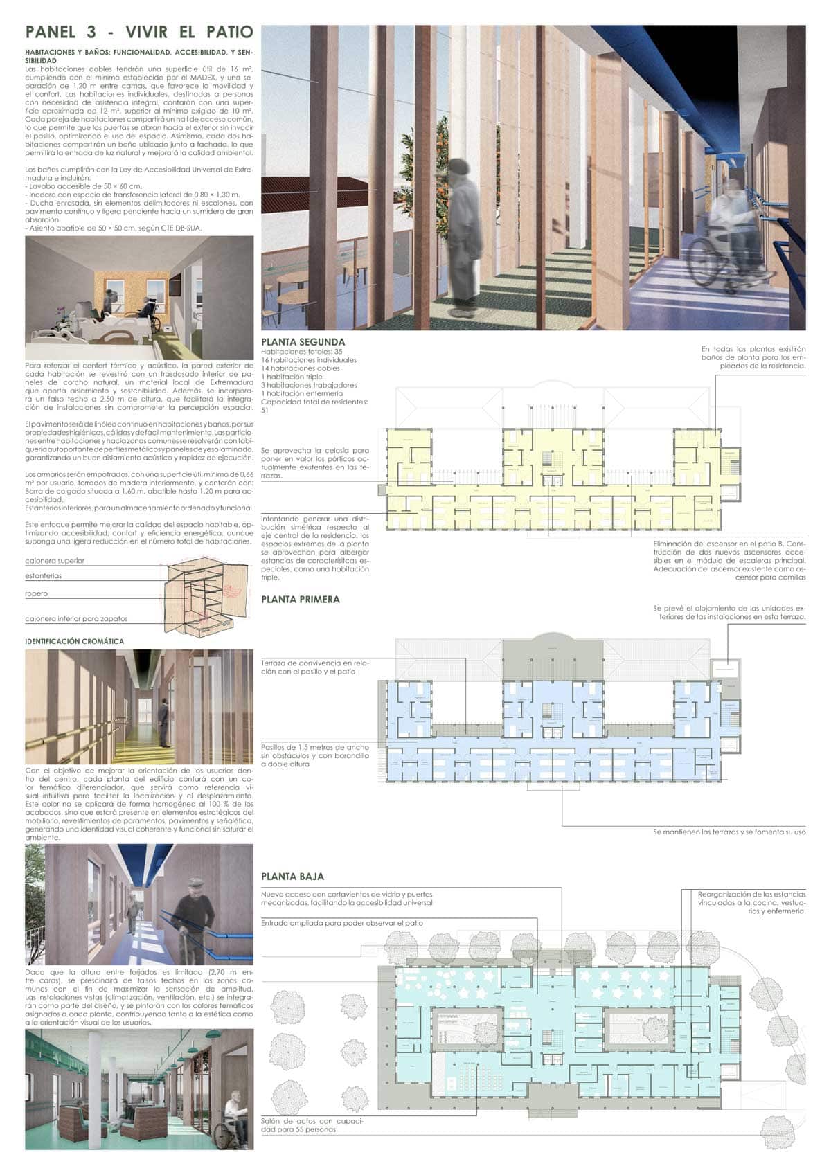 La nueva organización interior se articula en torno a dos patios centrales, convertidos en núcleos activos de relación, bienestar y orientación. En torno a ellos se distribuyen habitaciones, zonas comunes y recorridos que favorecen la autonomía y la orientación intuitiva. Cada planta se distingue mediante una paleta cromática suave y reconocible —verde, azul y amarillo pastel— aplicada a pavimentos, barandillas y mobiliario. Esta estrategia cromática refuerza la percepción espacial y genera ambientes domésticos, acogedores y fáciles de identificar.