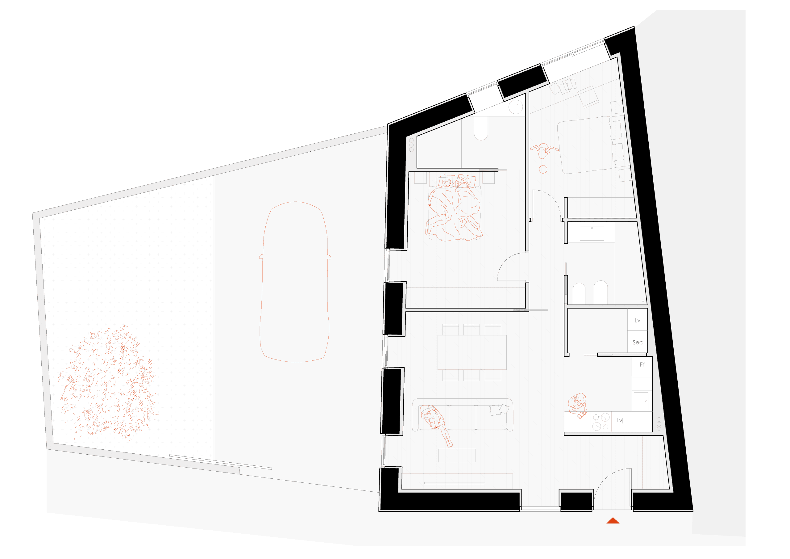 La nueva organización interior transforma el espacio diáfano existente en una vivienda funcional compuesta por vestíbulo de acceso, salón–comedor–cocina en un espacio integrado, dos dormitorios, un baño general, un aseo, zonas de almacenamiento y un espacio de lavadero-tendedero, articulados mediante un pequeño pasillo distribuidor.