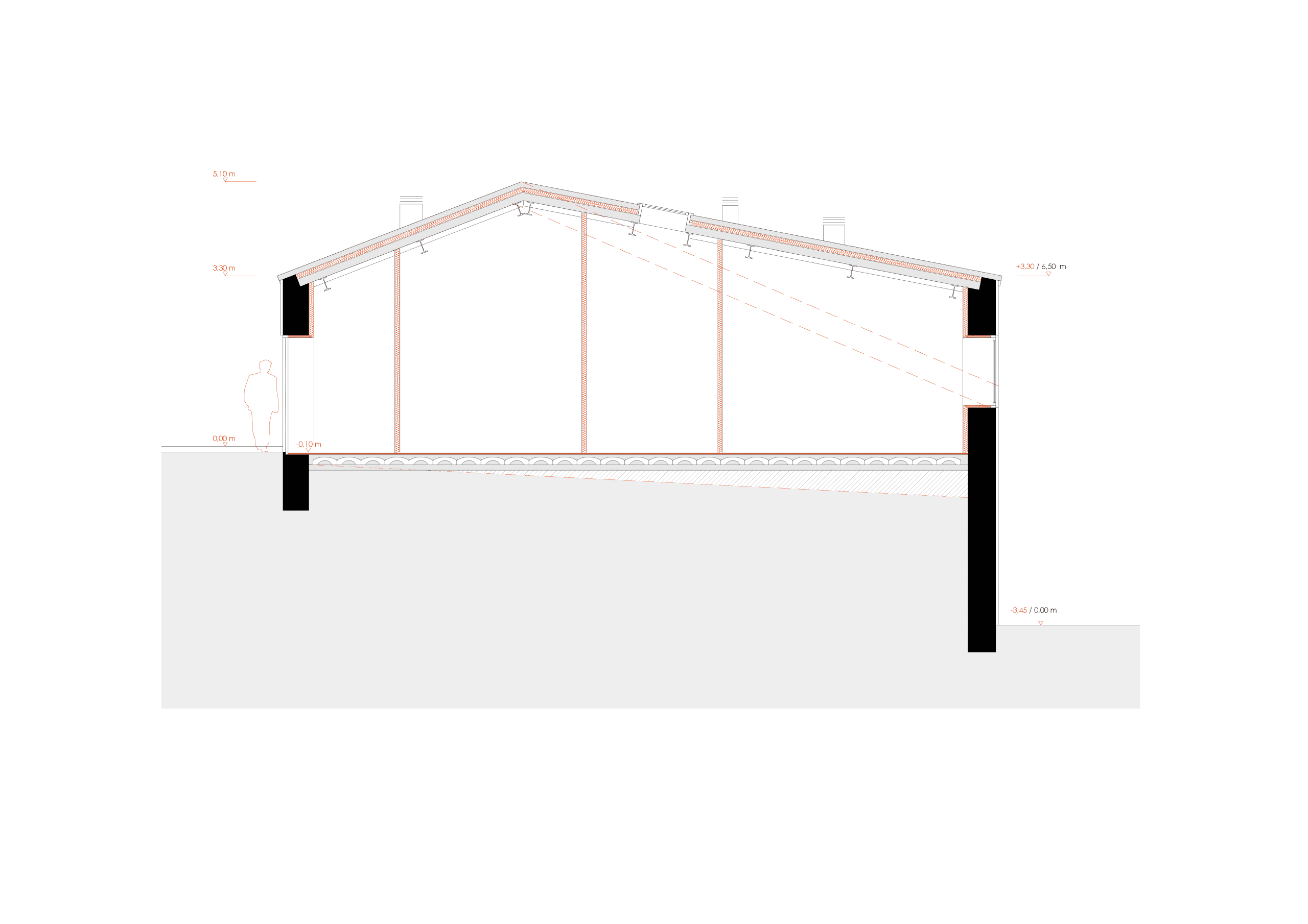 Un aspecto relevante de la propuesta es la regularización de la línea de cornisa, con el objetivo de unificar su altura y mejorar la proporción volumétrica del edificio. Para conseguirlo, se ajusta ligeramente la pendiente del faldón posterior de la cubierta, manteniendo la morfología general a dos aguas y desplazando ligeramente la posición de la cumbrera.