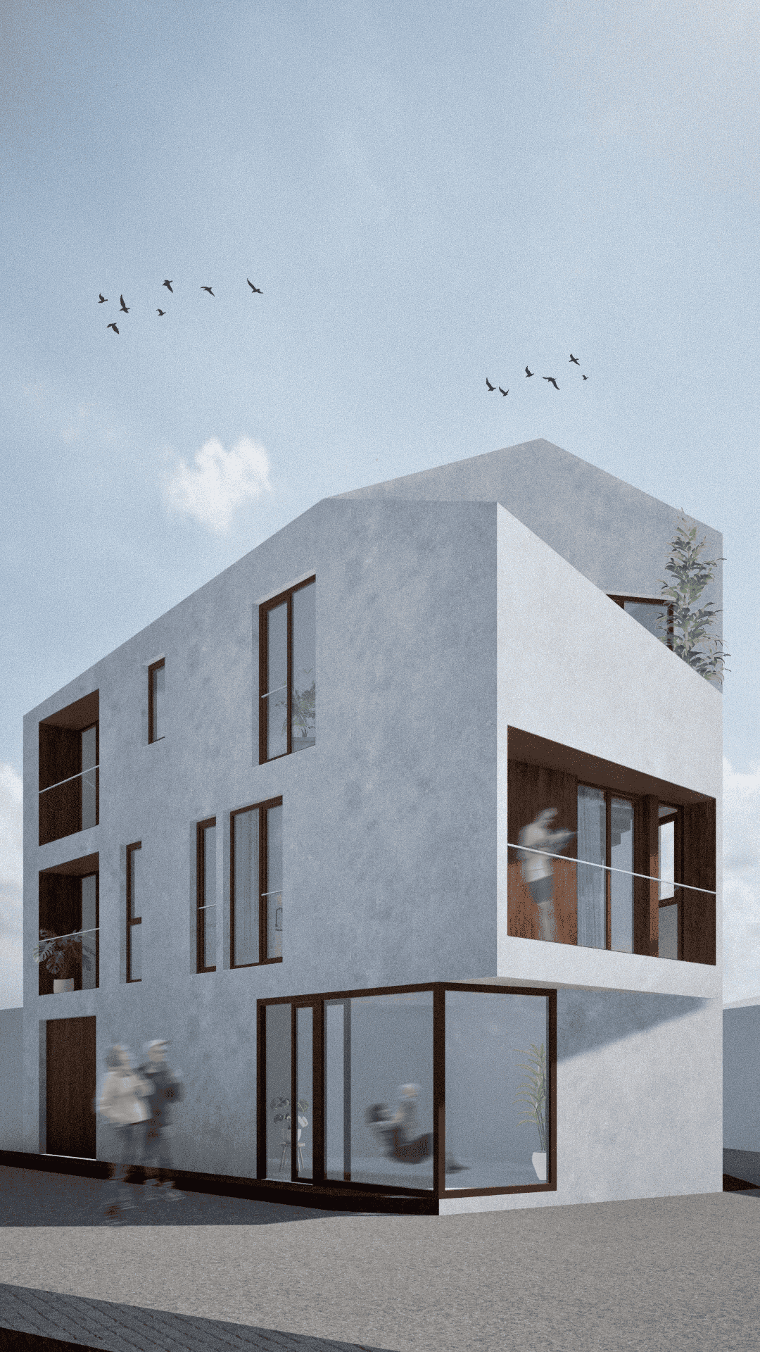 El proyecto consiste en la construcción de un edificio de uso mixto compuesto por planta baja y dos plantas superiores (B+2). En la planta baja se ubican un local comercial y un garaje vinculado a la vivienda, mientras que las plantas superiores se destinan al uso residencial.